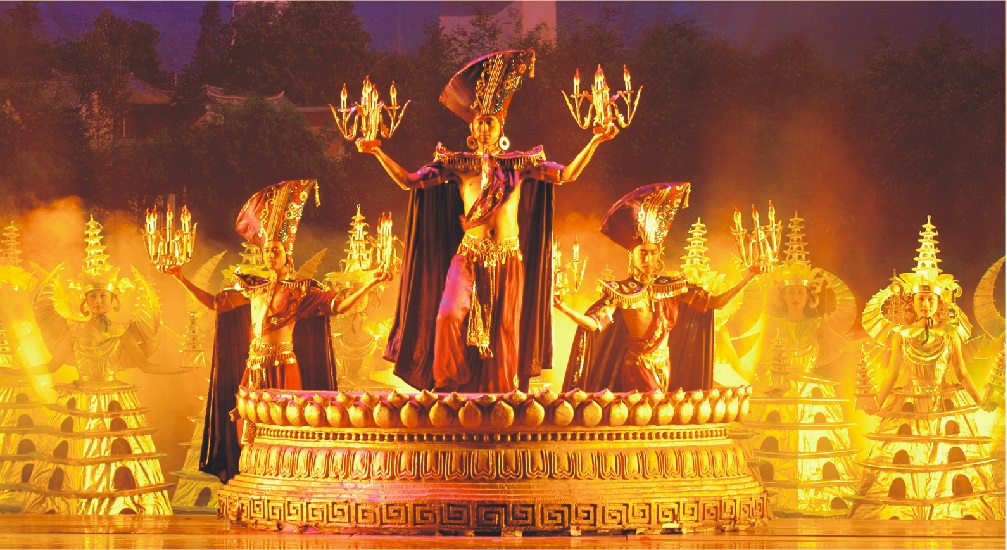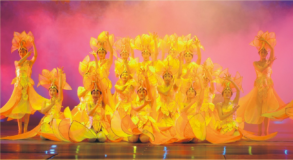 融入當代的歌舞審美意識。通過"燈光染色"、"推拉平轉、升降懸空"等舞臺設施營造夢幻效果,通過