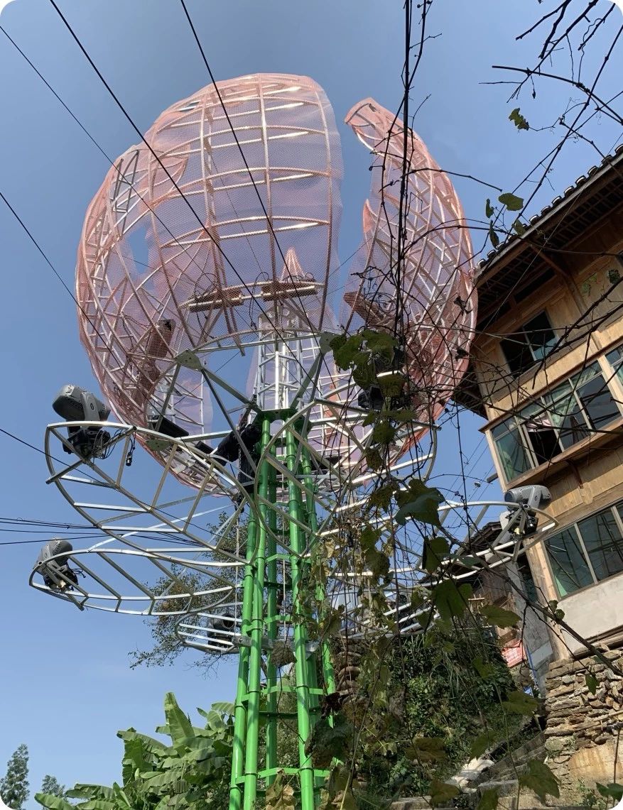 一部心史鑄魂魄,一曲長歌頌家園。《西江盛典》以山水實景苗族村落雞鳩苗寨為舞臺背景,以村民生產生活用品為舞臺道具,結合大塘景區的地貌山形,構成了舞臺劇場,真實再現了原生態。山體上,懸掛著的巨型牛頭;半山腰,一架紡織機,織出一條銀河之路散落山間;山腳下,聳立著壯觀的四面銅鼓群;村落中,遍布著25盞蓮花燈;清河邊的大水車旁,是有著600多年歷史的獨特建筑“水上糧倉”。