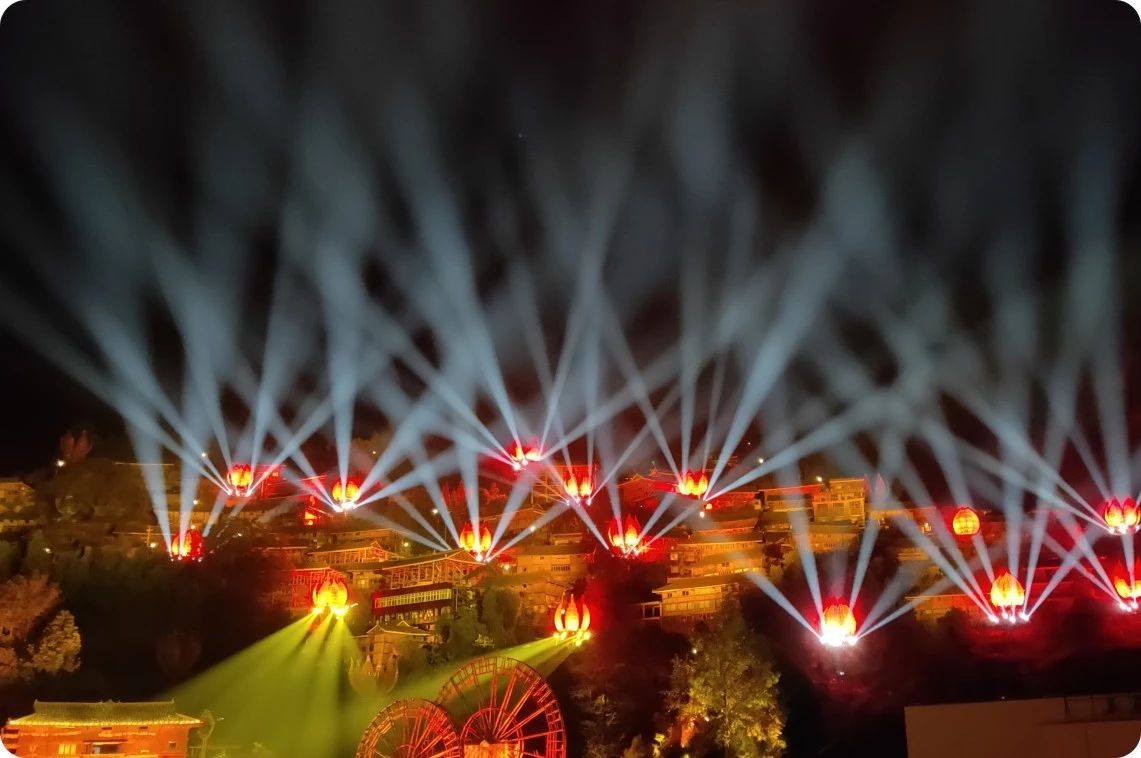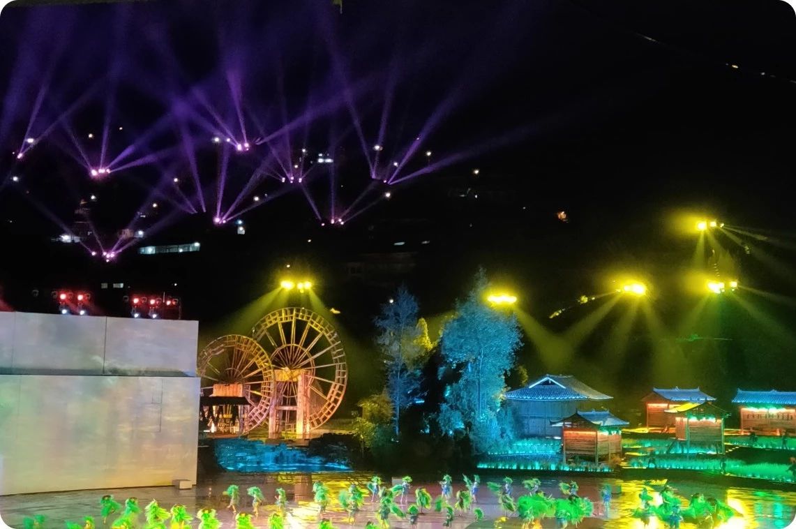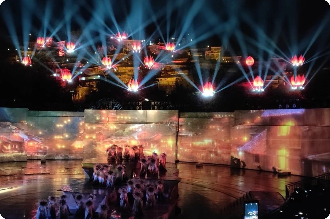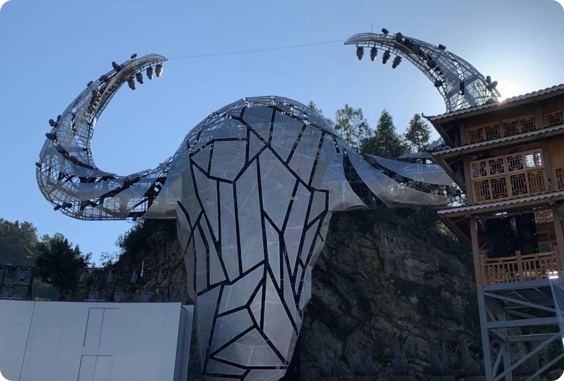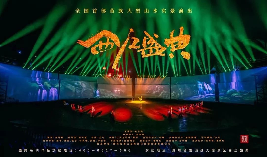 一首歌抒發一種情懷,一部戲還原一段歷史,整場演出燈光的處理正是將這種情懷、這段歷史傳遞給每一位觀眾,用光來訴說古老而神秘的苗族文化?!段鹘⒌洹吩谡嫉孛娣e9000平米的舞臺上, 360度移動裝置的觀眾席,能夠最大限度的讓觀眾觀看超過360度的演出內容,結合舞臺八塊景片環形幕、數千臺燈光、大型牛頭裝置、大型機械鐵花、苗族山水實景與升降舞臺演出,《西江盛典》震撼你的,不僅僅是演出,更是一場聲光電科技完美配合的視覺盛宴和厚重的苗族文化積淀。
