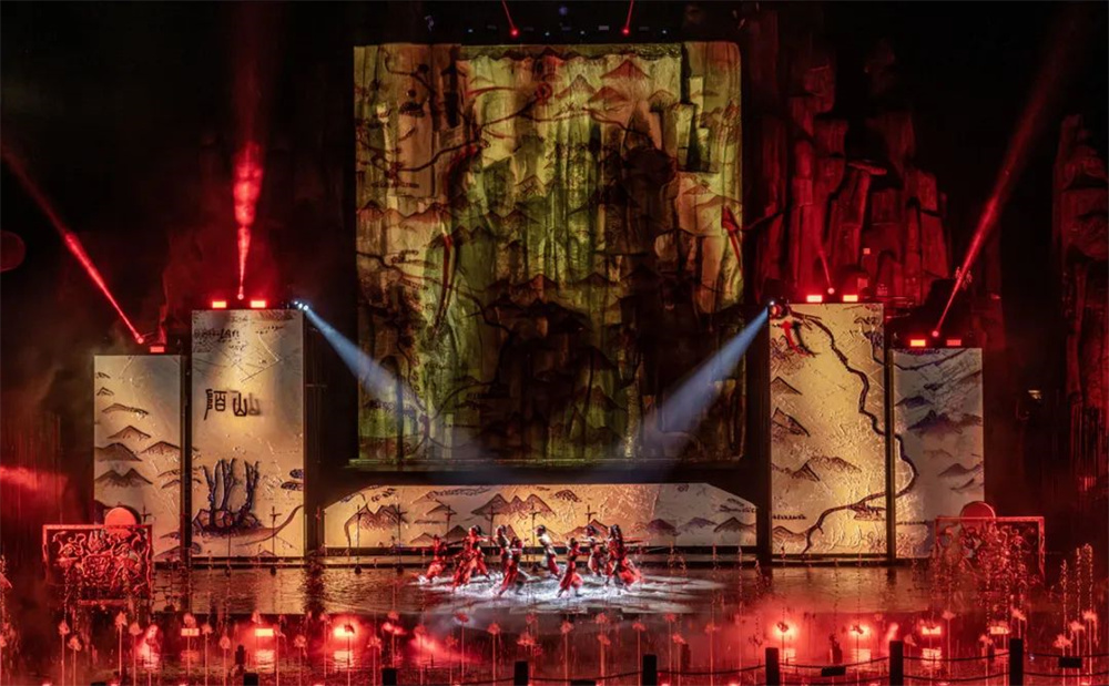 歐瑪OMARTE多款燈具,防水搖頭光束燈,防水LED搖頭切割燈,防水LED搖頭染色燈與山為背景,水為舞臺,水光融合,波光粼粼,色彩萬千,用現代科技藝術表達形式與視覺光影,同時通過場景裝置豐富演出種類形式,增強演出互動體驗感、視覺感、儀式感。