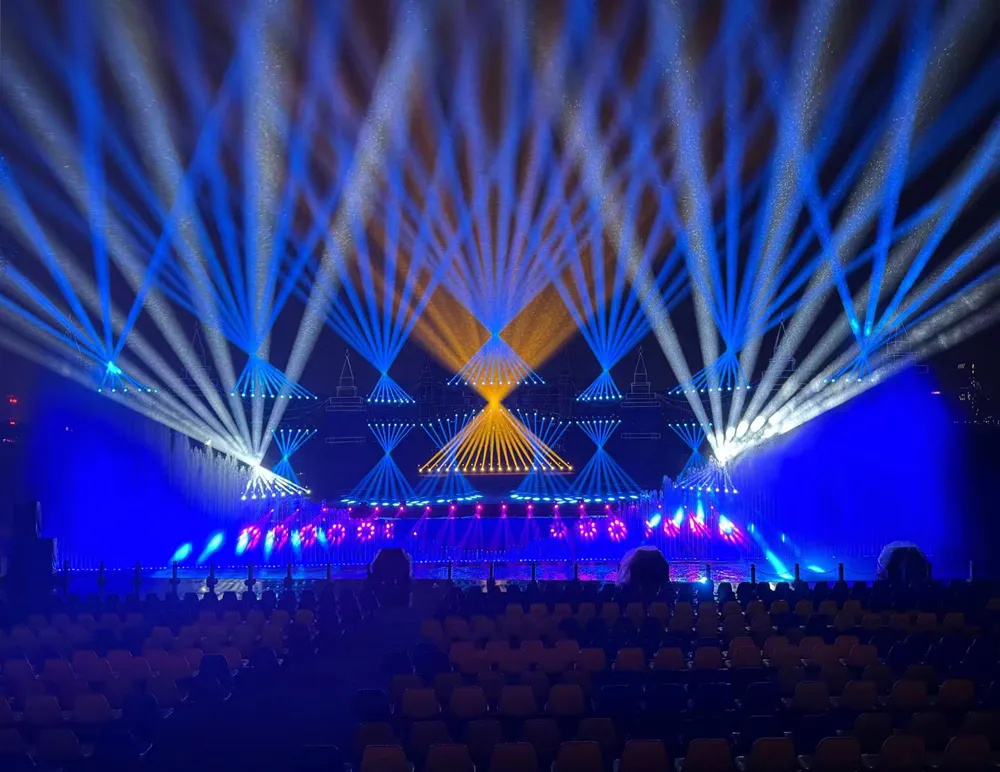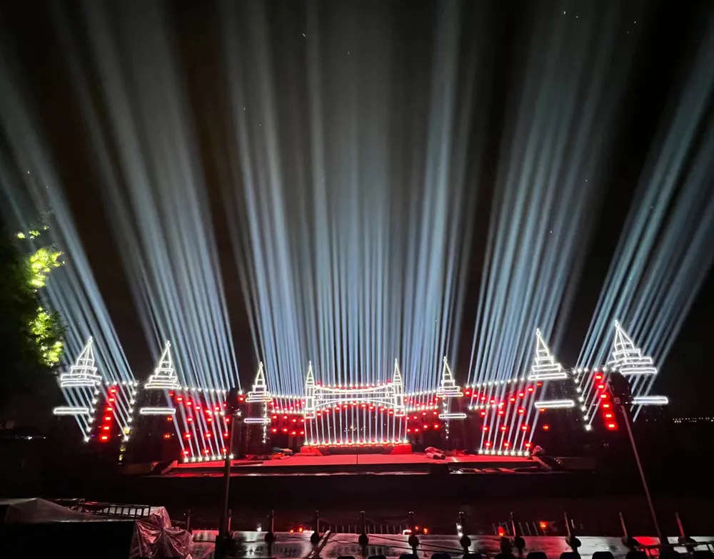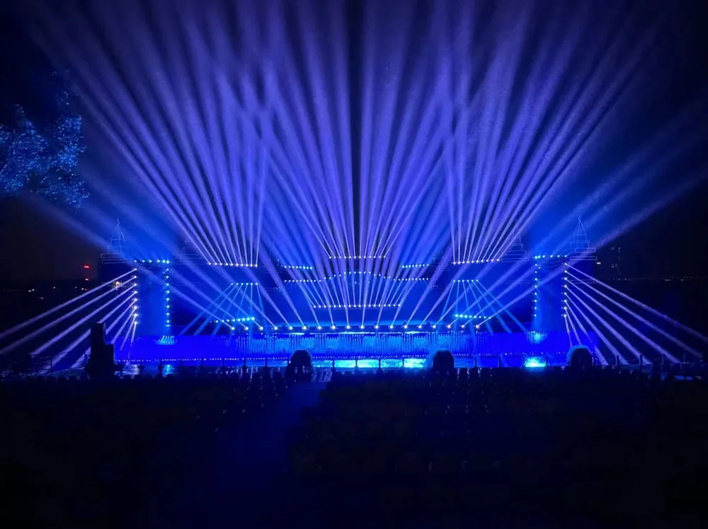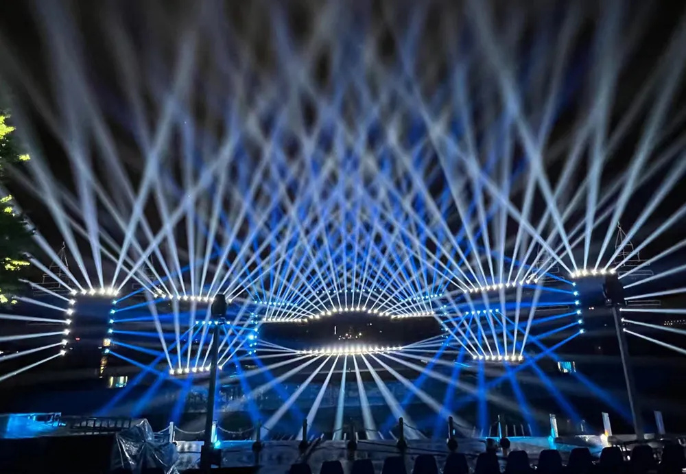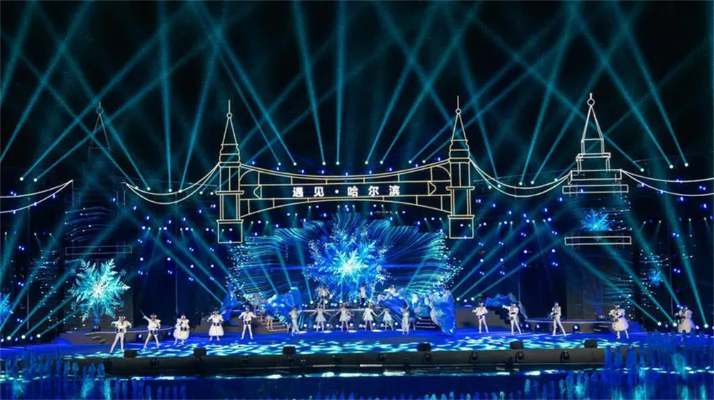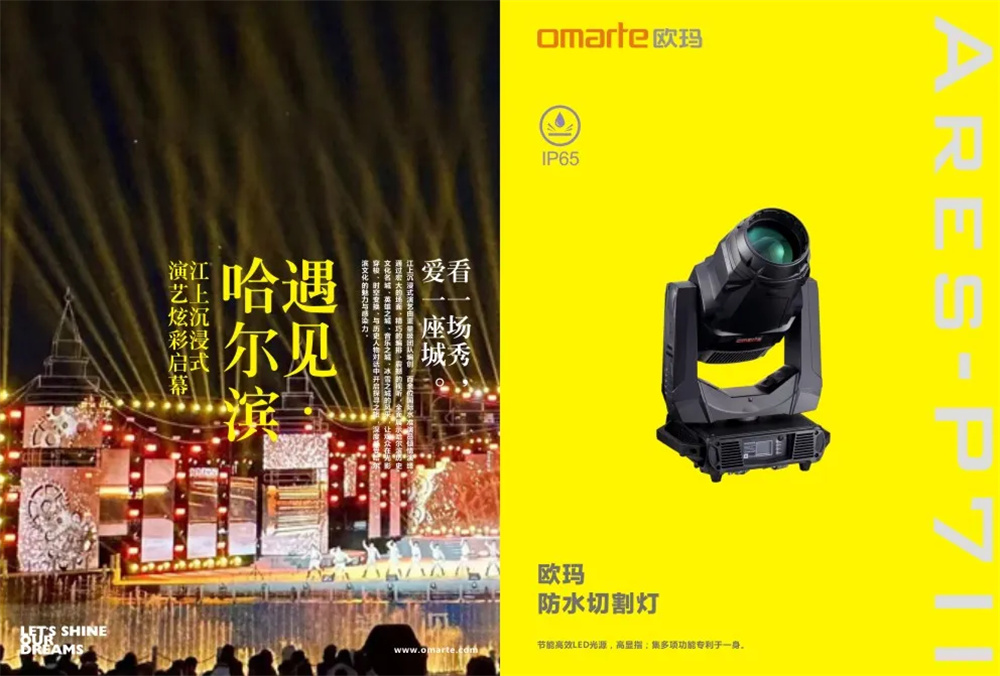 《遇見?哈爾濱》江上沉浸式演藝使用歐瑪防水切割燈、防水光束燈、搖頭染色燈近500臺。