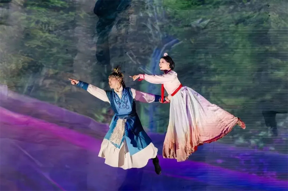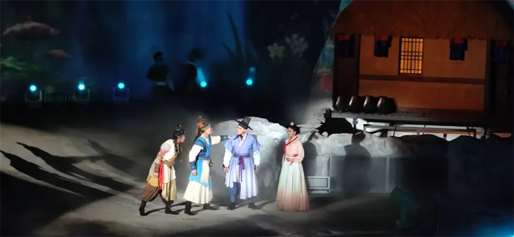 《長白戀歌》是一場深度沉浸式的演出,巧妙地融合了關(guān)東文化、滿族民俗、朝鮮族風(fēng)情、長白山地質(zhì)奇觀與民間傳說,借助現(xiàn)代科技與傳統(tǒng)藝術(shù)的魅力,讓觀眾仿佛穿梭于時空的隧道,見證了一段段動人心魄的歷史片段。從長白山的壯麗美景,到朝鮮族的熱情好客,再到滿族的神秘莊重,每一幕都是一幅生動的畫卷,訴說著這片土地的過往與未來。