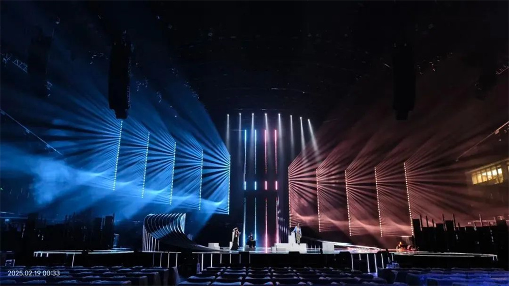 晚會燈光設計強調簡潔、清晰的線條感,以及功能性與美學的結合。通過精準的光影搭配與舞臺元素的協同作用,提升了表演的視覺沖擊力和情感共鳴。設計師巧妙運用光的物理屬性,在不同的表演段落中精準調控光束的方向、角度、色彩變化,細膩自然地引導觀眾情感隨表演變化而起伏,為觀眾創造融入感十足的視聽體驗。