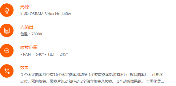 采用歐司朗440W鉑金光源,超高亮度輸出,穿透力也超強。出光角度.15°-32°全線性變焦系統,既能做光束燈,也可以當做圖案燈、染色燈、動感效果燈使用,是一款全能型的電腦燈。外置系統快速升級接口,可以一次性批量升級燈具系統。自帶獨有的隱藏式折疊燈鉤專利集成系統。帶有設計專利的CMY混色系統。專利設計的全線性變焦模組及散熱系統。雙棱鏡之間可相互切換也可以同時疊加,配合旋轉圖案以及豐富的顏色,制造出光彩奪目的燈光效果。