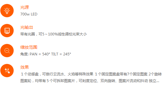 Ares-S6/Ares-S6A使用了大功率700W LED光源,20000小時(shí)超長壽命。外置系統(tǒng)快速升級(jí)接口,可以一次性批量升級(jí)燈具系統(tǒng)。自帶獨(dú)有的隱藏式折疊燈鉤專利集成系統(tǒng)。獨(dú)有的設(shè)計(jì)專利五彩棱鏡,棱鏡效果更具多變性。7.8°-52°超大范圍的出光角,少數(shù)幾臺(tái)燈就能把整個(gè)舞臺(tái)鋪滿。完美的線性調(diào)光,輸出光斑非常均勻,中心照度和邊緣照度偏差不超過6%,就算在最低亮度,也不會(huì)出現(xiàn)光斑不均勻的情況。