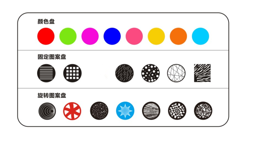 · 1個旋轉(zhuǎn)圖案盤:7個插拔式的旋轉(zhuǎn)圖案片+空白,帶有圖案抖動和任意定位功能