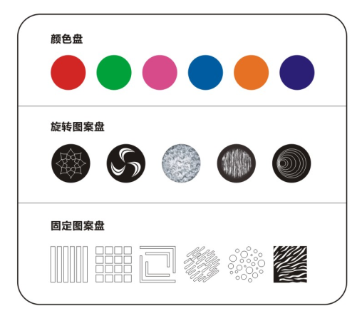 ·?2個旋轉圖案盤:各有5個插拔式的旋轉圖案片+空白;帶圖案抖動和任意定位功能